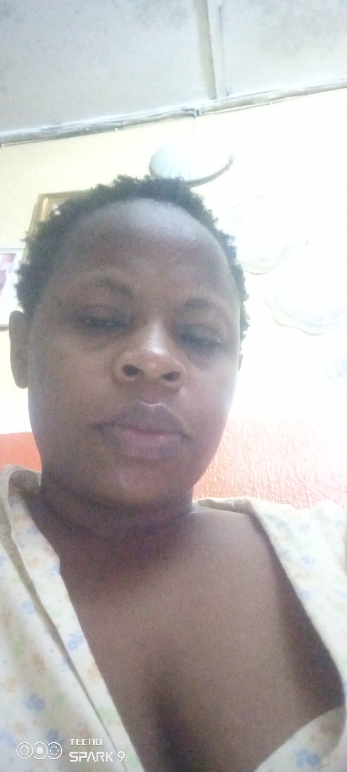 A brightly lit, close-up selfie depicts an adult female indoors. The subject has dark skin and short, dark, kinky hair. Her eyes are closed or heavily lidded, and her expression is neutral. She is wearing a light-colored garment, possibly a nightgown or robe, with a subtle pastel floral or patterned print, revealing her upper chest. The background shows a textured, light orange wall on the right and a light-colored ceiling with visible seams. A circular, white dome-shaped light fixture is present on the ceiling above her head, to the left. To the right, two white, circular objects, possibly parts of ceiling fans or decorative fixtures, are partially visible. A golden-framed object, likely a picture or mirror, is partially visible on the upper left. The image contains a "TECNO SPARK 9+" watermark in the bottom-left corner. The indoor domestic setting is consistent with residential areas in Lagos, Nigeria, though a specific district cannot be identified from the visual information provided.