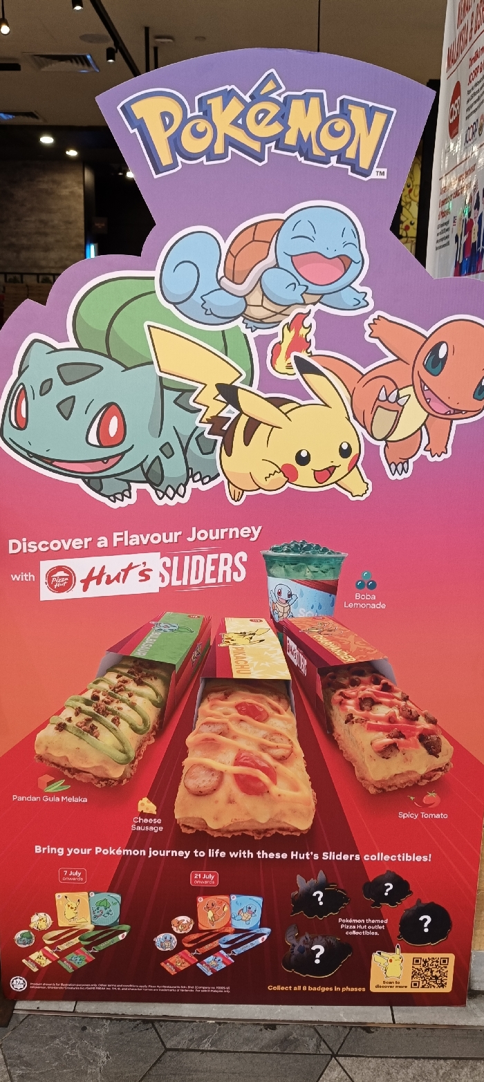 A full-color promotional standee, approximately vertical in orientation, is displayed within an indoor commercial setting. The upper section features the "Pokémon" logo in yellow and blue against a purple backdrop. Below the logo are cartoon illustrations of four Pokémon characters: Bulbasaur (green, left), Pikachu (yellow, center), Charmander (orange, right), and Squirtle (light blue, upper center). The middle section, on a red and orange gradient background, promotes "Pizza Hut's SLIDERS" as a "Flavour Journey." Three rectangular food items, identified as sliders, are presented in themed cardboard boxes. From left to right: a green-topped slider labeled "Pandan Gula Melaka," a yellow-topped slider with sausage slices labeled "Cheese Sausage," and a red-topped slider with meat bits labeled "Spicy Tomato." A clear cup containing blue boba-like pearls in a blue liquid, labeled "Boba Lemonade," stands behind the sliders and features Squirtle artwork. The bottom section, on a darker red background, advertises "Hut's Sliders collectibles." Two sets of Pokémon-themed badges and lanyards are shown with release dates: "7 July onwards" featuring Pikachu and Bulbasaur items, and "21 July onwards" featuring Charmander and Squirtle items. Five dark, silhouette shapes with question marks indicate "Pokémon themed Pizza Hut outlet collectibles," with instructions to "Collect all 8 badges in phases." A QR code with a small Pikachu icon is present for further information. Small text at the bottom explicitly states the promotion is "For sale in Malaysia only." The immediate environment includes a dark gray tiled floor with lighter grout lines. The background reveals an out-of-focus interior with a dark ceiling structure, recessed lighting, and black track lighting. A partial white sign with red text, including "JCORP," is visible on the far right, further confirming the Malaysian context. Specific identifying features for the city of Johor Bahru are not present in the image.