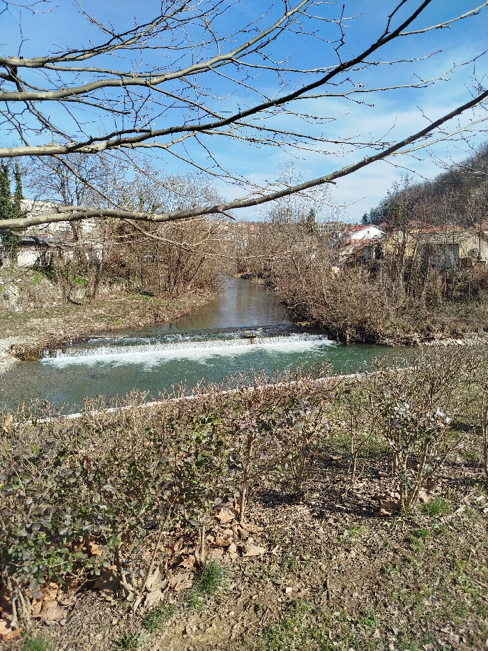 The image depicts a riparian landscape within the city of Gabrovo, Bulgaria, likely along the Yantra River or one of its tributaries. The scene is observed under a clear blue sky with minimal cloud cover, viewed through the bare, intricate branches of deciduous trees in the foreground, suggesting a late winter or early spring season. A body of water, appearing to be a river, flows from the background towards the foreground, occupying the central horizontal plane of the image. Approximately one-third of the way from the bottom edge, a low weir or cascade spans the width of the river, creating a distinct white, foamy waterline where the water spills over. The water above the weir appears calmer and darker, while the water below is lighter green-blue with ripples. The riverbanks are densely lined with mostly bare deciduous trees and shrubs, indicating a lack of foliage. On the left bank, partially obscured by vegetation, are visible sections of light-colored buildings, possibly residential or industrial structures. On the right bank, a steep, tree-covered hillside rises, with several residential buildings featuring red-tiled roofs nestled into the slope, visible through the sparse tree cover. The immediate foreground consists of dry, fallen leaves and patches of sparse green grass on unpaved ground. A low line of pruned bushes, some retaining a few green leaves, runs across the bottom section of the image, separating the viewer's position from the river. No individuals or animals are present in the visible scene.