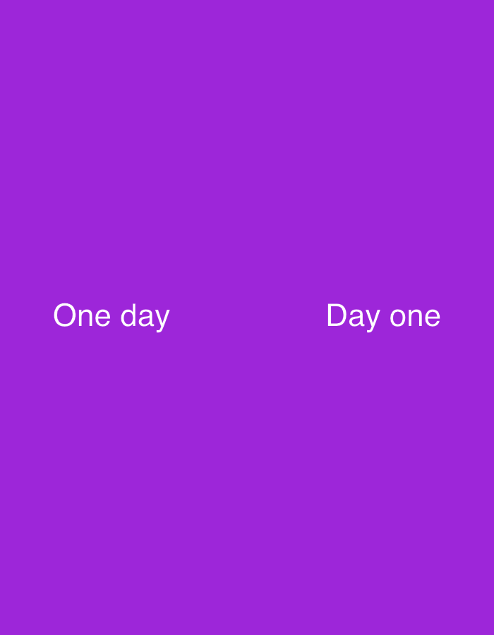 A digital graphic is depicted on a solid purple background. The scene, located in Haidian District, China, features two white text phrases in a sans-serif font, horizontally aligned in the lower central portion of the image. The phrase 'One day' appears on the left, and 'Day one' is on the right. No individuals, physical objects, actions, or interactions are visible within this environment.