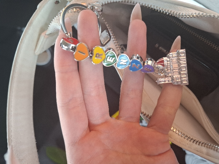 The scene is set within the city of Panagyurishte, Bulgaria. A light-skinned human right hand, featuring long, manicured fingernails with a neutral polish, is prominently positioned in the center of the frame. The hand holds a souvenir keychain. The keychain consists of seven individual metallic heart-shaped charms, each with an enameled letter, spelling "FIRENZE" from top to bottom: an orange 'F', a red 'I', a yellow 'R', a green 'E', a light blue 'N', a dark blue or purple 'Z', and a final purple 'E' (or a similar color for the last 'E'). Below these letter charms, a silver-toned metal charm depicting the Florence Cathedral (Duomo) with its dome is attached, with the word "DUOMO" embossed beneath the architectural representation. This keychain is attached to a light-colored, possibly beige or off-white, handbag, a portion of which is visible, including a metal zipper track and part of its strap. The background is blurred, indicating an indoor or vehicle interior setting.