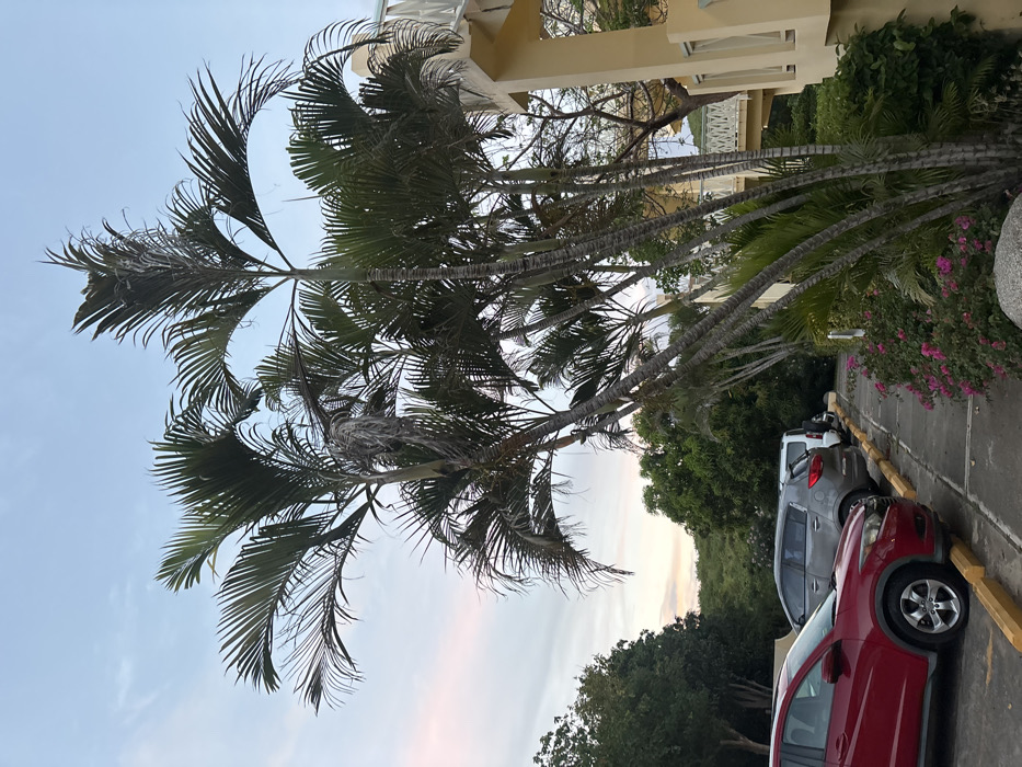 This image depicts a parking area and garden beside a building in Olde Yard Village, British Virgin Islands, during twilight hours. The sky is light blue with subtle pink and white clouds. In the foreground and midground, numerous palm trees with green fronds, some exhibiting signs of dryness or damage, dominate the right side of the frame. A lush green hilly landscape with dense vegetation forms the background on the left. On the left, a paved parking area is visible with yellow concrete parking barriers. Three vehicles are parked: a red SUV, likely a Honda HR-V, is in the foreground, followed by a grey SUV (possibly a Kia Sportage), and a partial view of a white SUV or Jeep in the distance. Adjacent to the parking area is a concrete walkway or pathway, bordered by a garden bed featuring pink flowering bushes and various green plants. A rounded, light grey stone is visible in the lower foreground. To the right, a multi-story building with a light yellow or cream-colored facade is present. It features white railings and balustrades on elevated walkways or balconies. Windows are visible along the building's exterior. No individuals are present, and no actions or interactions are depicted. The scene is static and devoid of human activity.