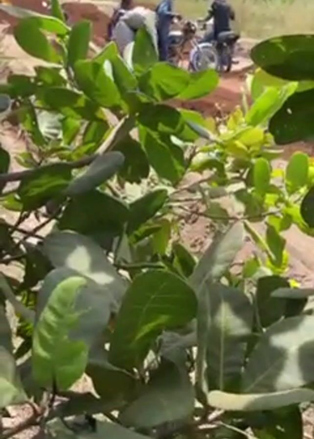 three people on two motorcycles. The first motorcycle appears to be carrying heavy bags. They are riding on a dirt road through a rural area. The video is shot from behind a bush with green leaves, partially obscuring the view. In the distance, a hill or mountain is visible. The light is bright and sunny.