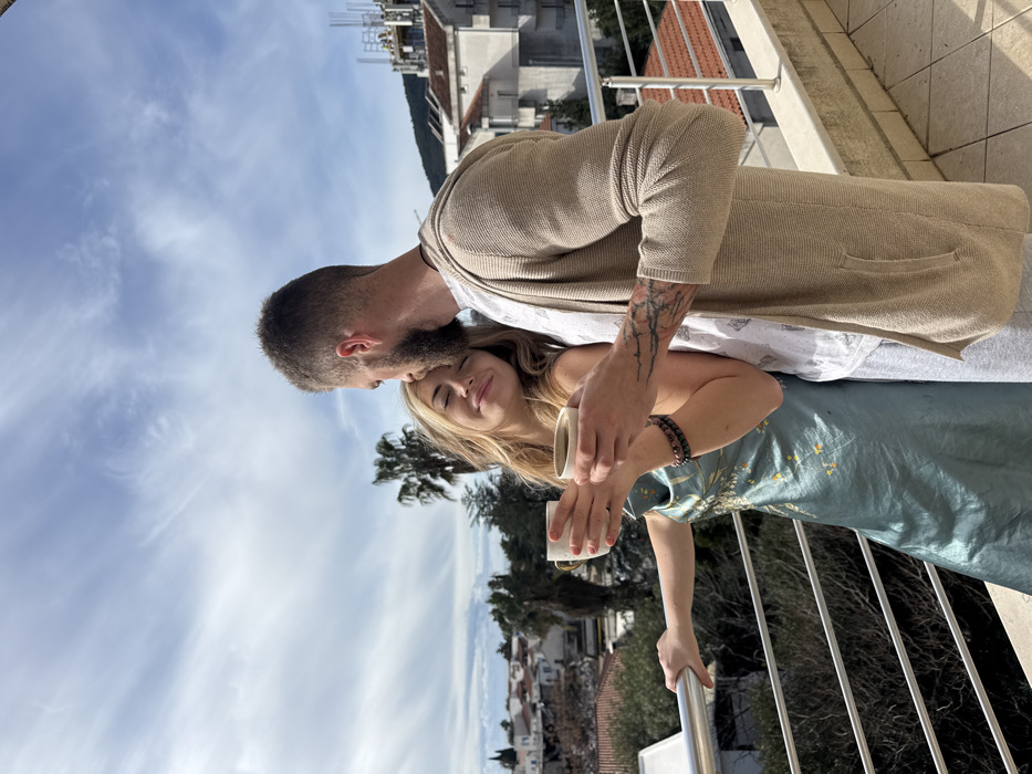 A daylight scene shows two individuals, a male and a female, standing on a balcony. The male, on the right, possesses a beard and short hair, wearing a light tan knitted cardigan over a white patterned t-shirt and light grey pants. Tattoos are visible on his left forearm. He holds a light-colored ceramic mug in his right hand and leans his head towards the female's forehead. The female, on the left, has blonde hair and wears a light teal slip dress with a subtle pattern. She holds a white ceramic mug in her left hand and rests her right hand on a silver-colored metal balcony railing. Her eyes are closed, and her mouth is slightly upturned. The background displays a densely developed urban area, characteristic of Budva, Montenegro. Buildings feature white or light-colored facades and predominantly red or orange tiled roofs. A tall palm tree stands prominently behind the subjects. In the mid-distance, a multi-story building under construction with exposed rebar and workers is visible on a hillside. Distant mountains are partially discernible on the far right. The sky is partly cloudy with patches of blue. The scene is observed from an elevated perspective, consistent with a balcony in a residential or hotel building within Budva.