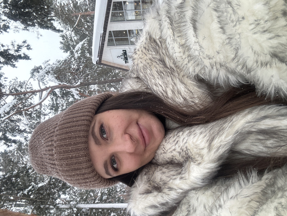 A young adult female is depicted in a head-and-shoulders portrait, positioned outdoors in a snowy environment