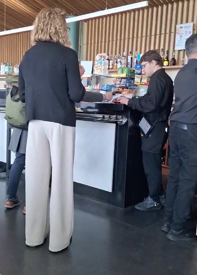 In an indoor setting, possibly a cafeteria or casual dining area, a scene unfolds with several people interacting and occupying the space. A woman with blonde curly hair, wearing a black sweater and wide-legged beige pants, stands at a counter with a white front panel, potentially paying for something. Behind the counter, two employees in black shirts and black pants stand. One appears to be assisting customers. Another individual wearing a gray coat and dark jeans stands near the woman, possibly waiting to be served or observing the transaction. Tables with chairs are visible in the background, with a few people seated and dining. A magazine rack filled with colorful stacks of publications stands off to the side. The floor is a dark gray tile. The ceiling is a pale color and features wood slats as part of the design.