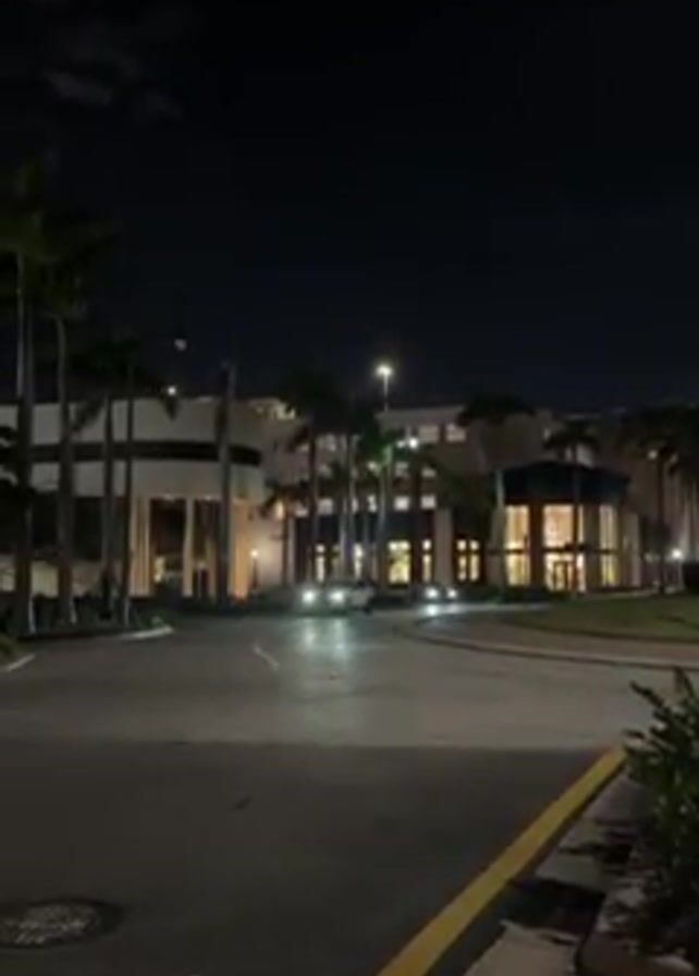 At night, a wide paved road leads towards a large, brightly-lit building, framed by numerous tall palm trees. Two cars are driving on the road, their headlights shining clearly. The building has a modern architectural style and features multiple windows that emit a warm, yellow glow. The sky above is dark. The scene is captured from a static position, with a sidewalk and a small patch of greenery visible in the foreground on the right side.