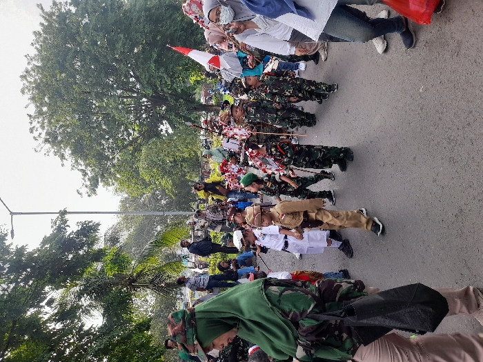 Children are lined up on a road, some in military costumes. Others are dressed in white, with a few wearing headscarves. Some hold red and white flags. Trees and a lamppost are visible to the left. People are standing on the side of the road, watching the children.