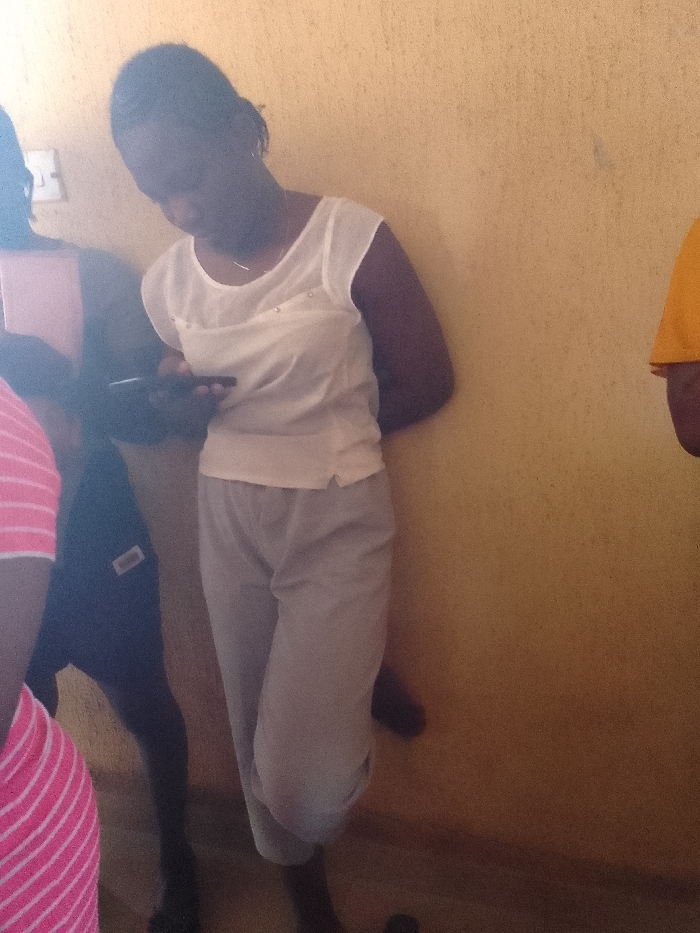 A young woman stands in front of a light-yellow wall, possibly inside a building. She is wearing a white, sleeveless top with a semi-sheer panel on the upper chest and gray pants rolled up to mid-calf. She is looking down at a black mobile phone in her hands. The woman has her back to the wall with her arms tucked behind her. Other people are partially visible around her, but their faces are not clear. The location is Unknown, Unknown.