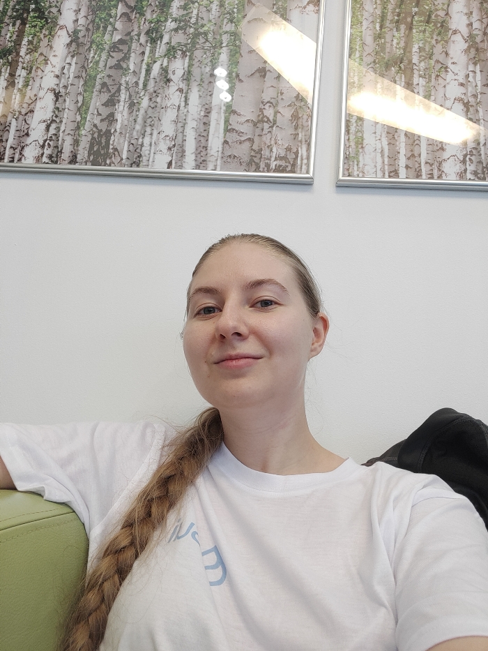 A female individual is depicted seated indoors, facing the camera directly with a slight smile. She is Caucasian, appears to be an adult, and has long, light brown hair styled in a single braid extending over her left shoulder and chest. She is wearing a white short-sleeved t-shirt with partial light blue lettering visible on the front. She is positioned on a light green upholstered chair or sofa, with a portion of the armrest visible on the left side of the frame. To her right, a dark fabric item, possibly a jacket or bag, is partially visible. The background consists of a plain white wall. Two rectangular framed pictures with silver-colored frames are mounted on the wall above the individual. Each picture displays an image of birch trees with white trunks and green foliage. Reflections from overhead light sources are visible on the glass of the framed pictures, including an elongated rectangular light and three circular lights. The specific location within the city of Otopeni, Romania, is not discernible from the visual evidence provided.