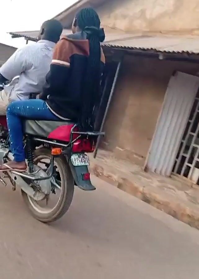 red motorcycle with two passengers riding down a paved road in a residential area. The driver wears a light-colored shirt and tan pants. The passenger behind him wears jeans and a hooded jacket, with long braids hanging down their back. As the motorcycle travels, other motorcycles and pedestrians are visible on the sides of the road. Buildings and utility poles line the street, providing a backdrop for the scene. The overall setting suggests a small town or neighborhood.