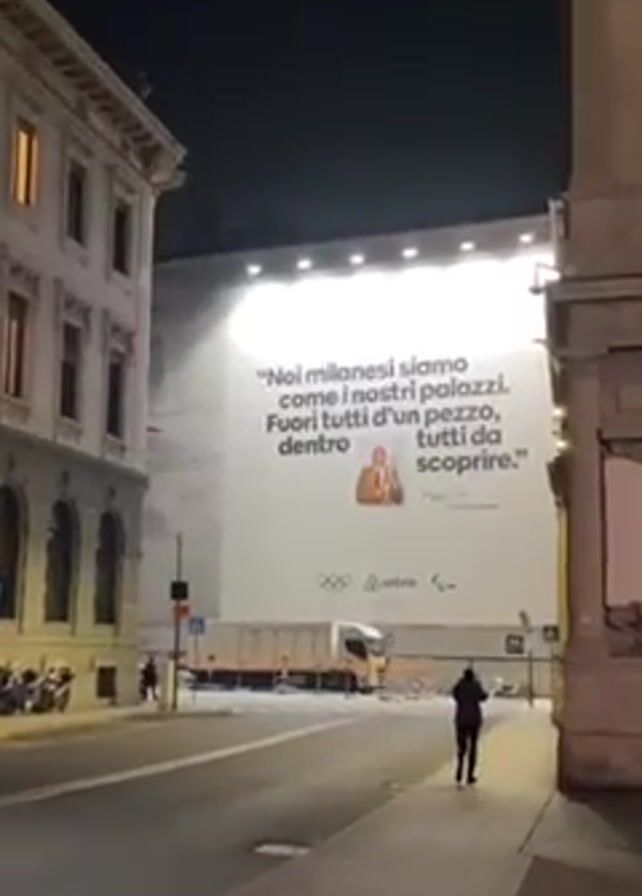 city street at night, with a large billboard illuminated brightly against a dark sky. The billboard features a quote in Italian: "Noi milanesi siamo come i nostri palazzi. Fuori tutti d'un pezzo, dentro tutti da scoprire," which roughly translates to "We Milanese are like our buildings. Solid on the outside, but full of surprises inside." A smaller image of a man is also on the billboard, along with the logos for Airbnb and the Olympic and Paralympic Games. Below is a signature that reads "Ermanno." The street is paved and has sidewalks on either side. Several parked scooters are visible near the building on the left. People walk along the sidewalk and a person on a red scooter drives down the street. A white truck is parked near the billboard. The buildings on either side of the street are light-colored and appear to be of classical design. The streetlights cast a warm glow.