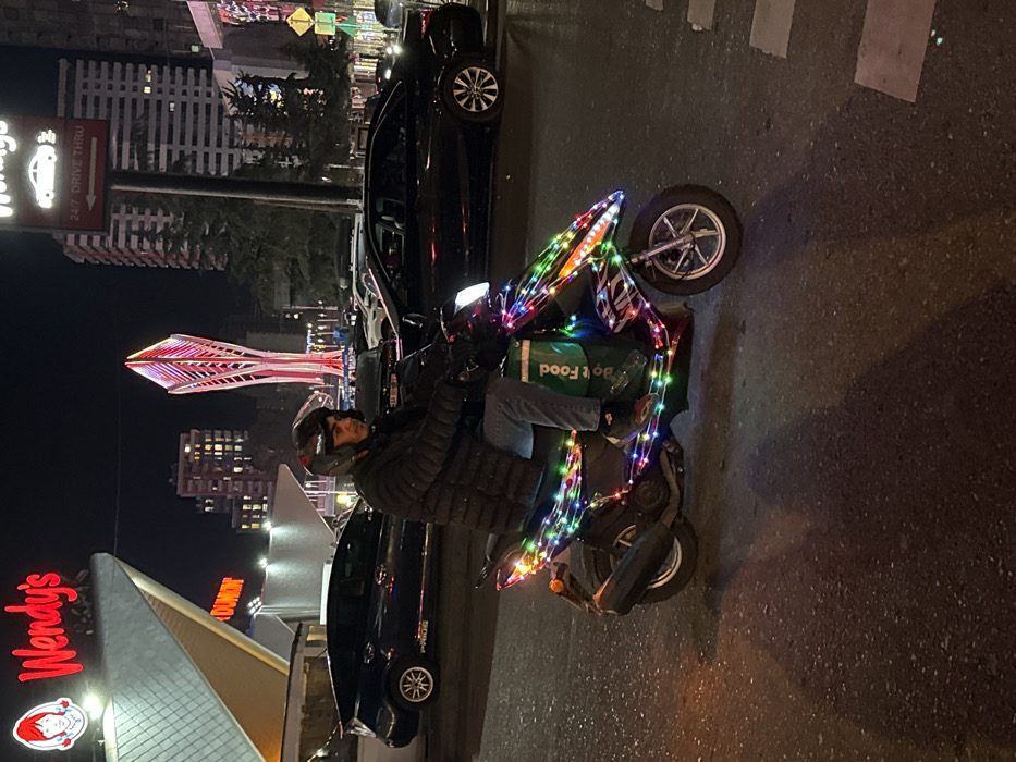 The image captures an urban street scene at night in Batumi, Georgia. The primary subject is a male individual riding a dark-colored scooter adorned with multiple strands of illuminated colorful LED lights in red, green, blue, and yellow. He wears a dark puffer jacket, light-colored pants, dark shoes, and a dark full-face helmet with a clear visor, looking forward and slightly to the right. A green "Bolt Food" delivery bag is positioned on the scooter's floorboard between his legs. In the background to the left, the illuminated red "Wendy's" sign and logo are visible on a building, with a partially visible "Dunkin'" sign below it. A dark blue Toyota Prius is parked or moving near these establishments. In the central and right background, a tall, distinctive, lattice-like structure, illuminated with red and white lights, stands prominently against the dark sky; this is identifiable as a landmark in Batumi, such as the Alphabet Tower. Surrounding structures include multi-story buildings, some with visible lighted windows, and several dark-colored vehicles parked or in motion. A street sign displaying a car icon and "24/7 DRIVE THRU" is also visible. The foreground shows dark asphalt pavement, with a segment of a white crosswalk line visible on the lower right.