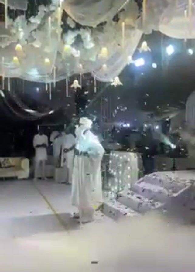 n elaborately decorated event space, likely a wedding reception. A person dressed in all white traditional attire is standing on the floor, surrounded by fog and falling confetti. There are other people standing in the background, also dressed in white. The space is lit with spotlights and string lights, and the ceiling is draped with white fabric and floral arrangements. There's a small stage in the background with steps, also decorated in white.
