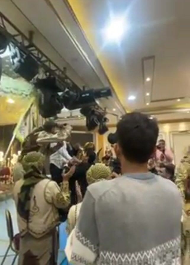 A man is lifted and held high in the center of a crowded, brightly lit hall. He is surrounded by other men, some wearing traditional Middle Eastern clothing, who are clapping and cheering. The man being lifted is dressed in a dark suit and white shirt. Other men are on the fringes of the crowd and several hold up their phones to record the scene. Lighting equipment is visible near the ceiling.