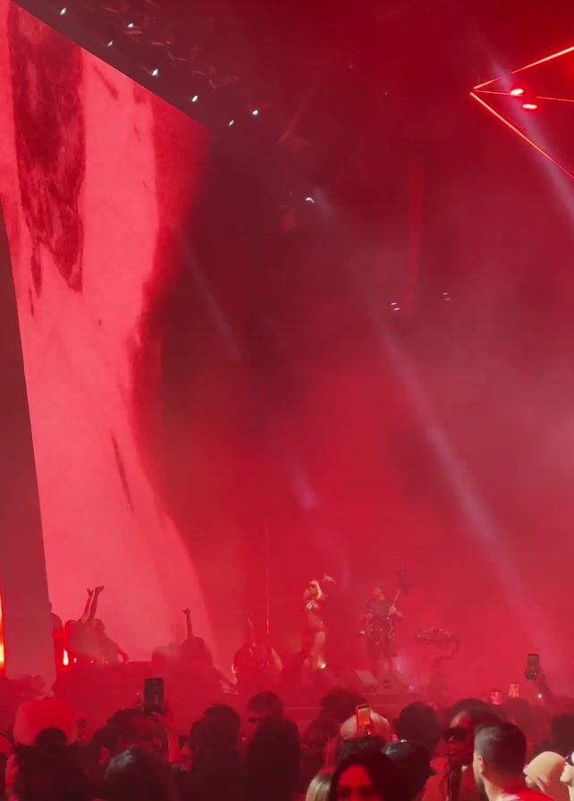 A crowd of people holds up phones, presumably filming a concert performance on a stage in front of them. The stage is backlit with bright red lights, and a large screen displays a blurry image. The stage area is filled with smoke, obscuring the details of the performers. Red lights flash in the background.