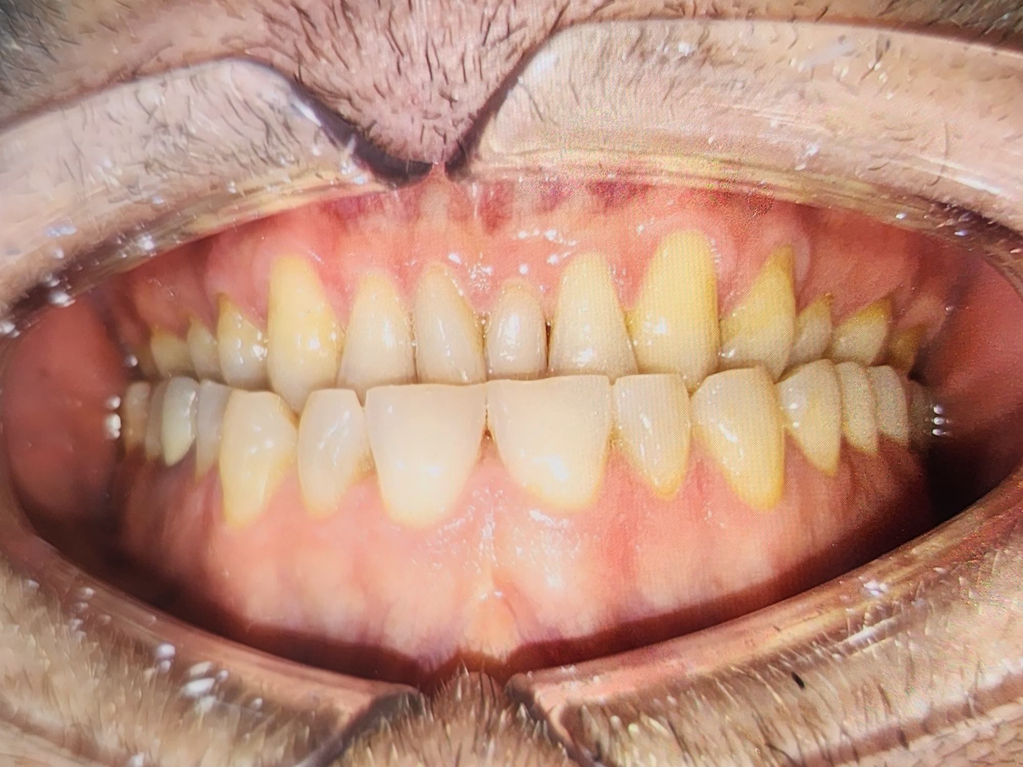 close-up view of an open human mouth with a full set of teeth. The teeth are generally yellowed. The gums are visible, appearing pink and somewhat inflamed. The inner lips and surrounding skin are also visible. The presence of facial hair around the mouth indicates the subject is likely male. No location is determined.