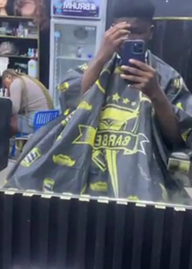 A young man wearing a black and yellow barber cape stands in front of a mirror in a barbershop and takes a selfie with his smartphone