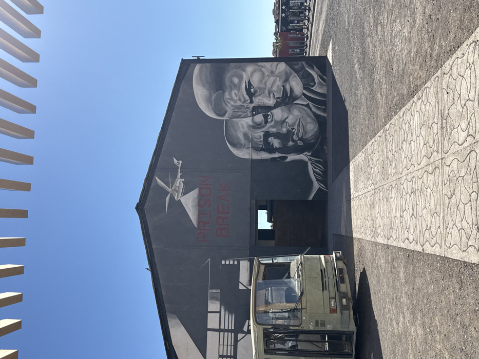The image displays an outdoor scene at a film studio, likely Atlas Film Studios or CLA Studios, located in Ouarzazate, Morocco, under a clear blue sky and bright sunlight. The central feature is a dark grey, single-story building with a prominent mural covering its facade. The mural depicts a light-colored helicopter projecting a searchlight beam, the red text "PRISON BREAK," and two stylized monochrome portraits of men with shaved heads; one figure, positioned left, appears to be smoking, while the other, on the right, has a stern expression. To the left of the building, an olive-green, older model bus is parked, facing forward. It appears to be a prop, with its front bumper, grille, and headlights visible, and possible missing side elements. A light-colored, paved pathway with a repeating geometric pattern leads directly from the foreground towards a dark, rectangular opening in the building, functioning as an entrance. The surrounding ground is composed of dark, loose gravel or dirt. Above, a series of parallel, light-colored horizontal beams partially frame the top of the image. Distant red and dark structures are faintly visible on the far right. No individuals are present in the immediate scene.