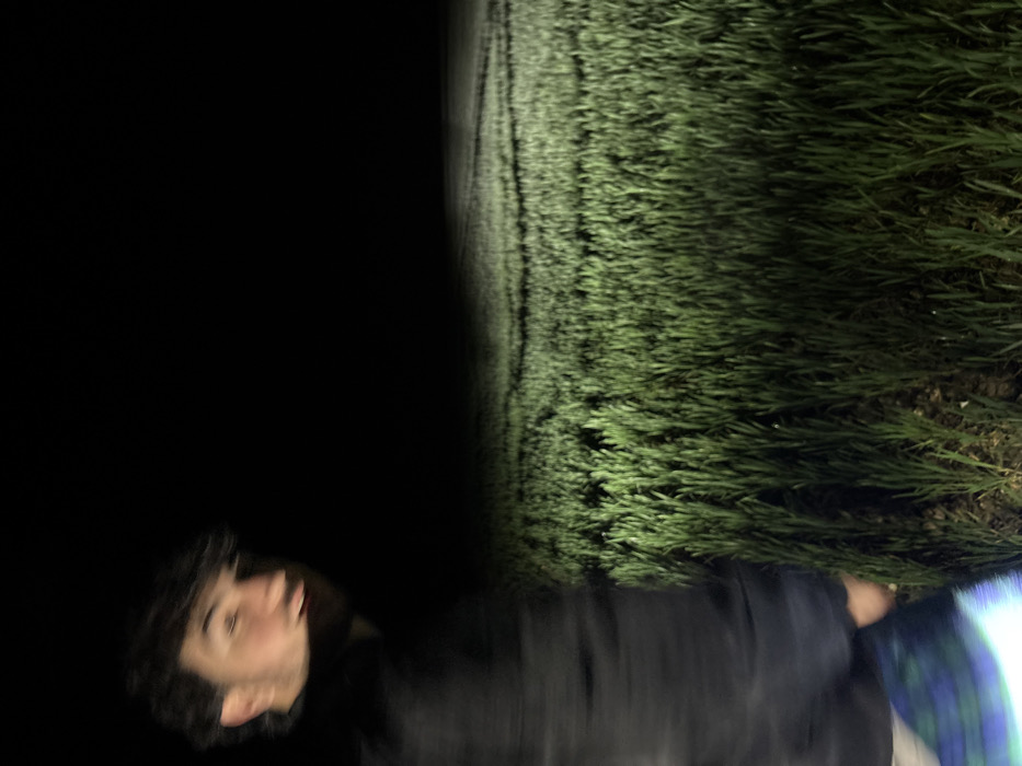 A nighttime scene in a cultivated field in Bû, France, is depicted. A single male individual, exhibiting motion blur, occupies the left side of the frame. He has dark, wavy hair and wears a dark upper garment and a plaid lower garment in shades of blue and green. His face is partially illuminated, turned towards the right, with his mouth slightly open. The background features a field of green, vertically growing crops, illuminated by an unseen artificial light source that casts light across the vegetation and creates a faint horizontal band of light in the distance. The sky above the horizon and the upper half of the image are completely dark.