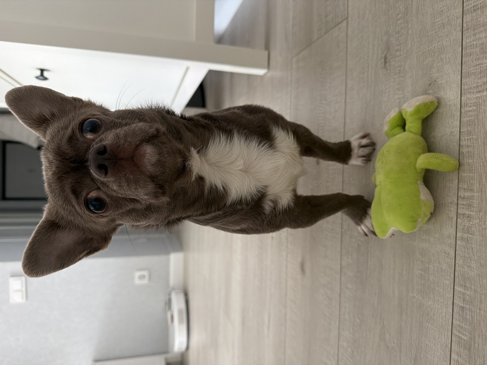 A brown and white Chihuahua stands on a light-colored wood floor next to a green stuffed toy, seemingly indoors. The location is unknown and cannot be determined to be Votkinsk, Russia, from the image alone. There are no people visible. A white object, possibly a robot vacuum cleaner, is partially visible in the background. A white piece of furniture is also visible behind the dog.