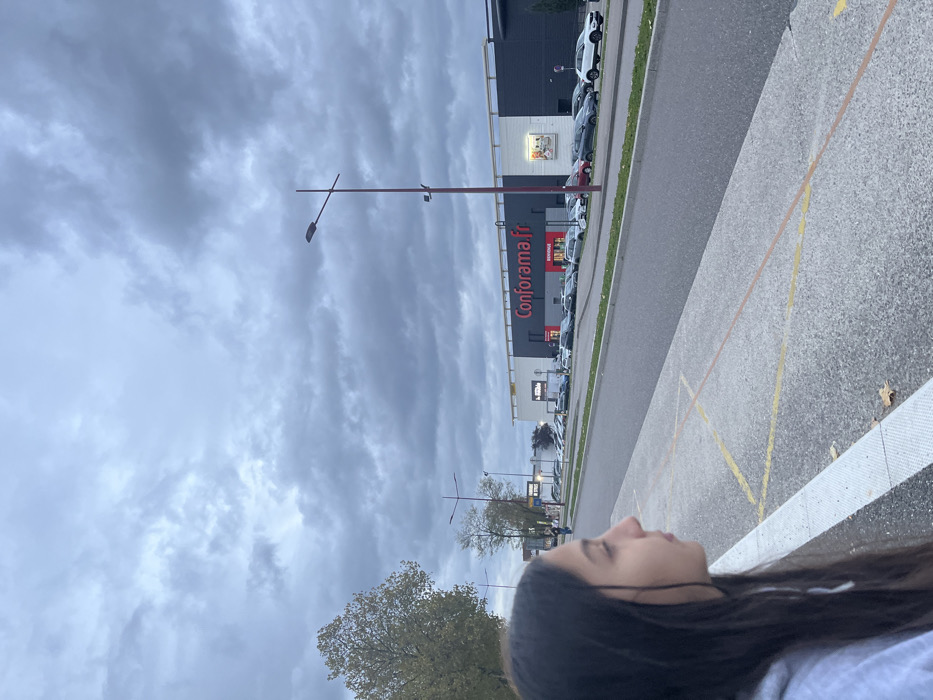 The scene depicts a commercial area in Vendenheim, France, under an overcast sky. In the foreground, the right profile of an individual with long, dark hair is visible, cropped at the upper torso. The individual wears a light-grey hooded garment and directs their gaze to the right. Immediately before them is a concrete curb with a white painted stripe, bordering a paved area marked with yellow and orange lines. Scattered dry leaves are present on the pavement. Beyond the pavement lies a two-lane asphalt road, separated by a narrow grassy median strip. In the midground, a large commercial building is prominently displayed, identified by a red "Conforama.fr" sign and a white "BIENVENUE" sign on its black and white facade. A parking lot situated in front of this building contains numerous parked passenger vehicles of various makes, models, and colors, including black, white, silver, and red. Two tall, reddish-brown street light poles, each fitted with a single lamp and additional fixtures, are positioned along the road and near the parking lot. Additional commercial structures and trees with sparse, autumnal foliage are visible in the left background. The sky above is entirely covered by a uniform layer of dense, grey clouds.