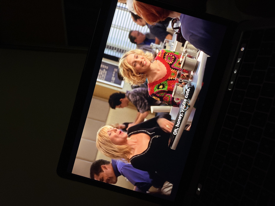 The image displays a laptop screen showing a scene from a video, observed from a location within the city of Torrent, Spain. The screen features two blonde women seated at a table in what appears to be a restaurant or diner. The woman on the left, with straight blonde hair, wears a black top with silver embellishments and is looking towards the right. The woman on the right, with curly blonde hair, wears a multicolored crocheted sweater with a red neckline and is smiling, looking towards the left. On the table between them are white mugs, sugar caddies, and glass containers. Subtitles at the bottom of the screen read, "Oh, honey, you're cute." In the background, other patrons are visible seated at tables. The laptop's keyboard and trackpad are visible in the foreground, illuminated in a dark room, indicating the viewing environment is dim.