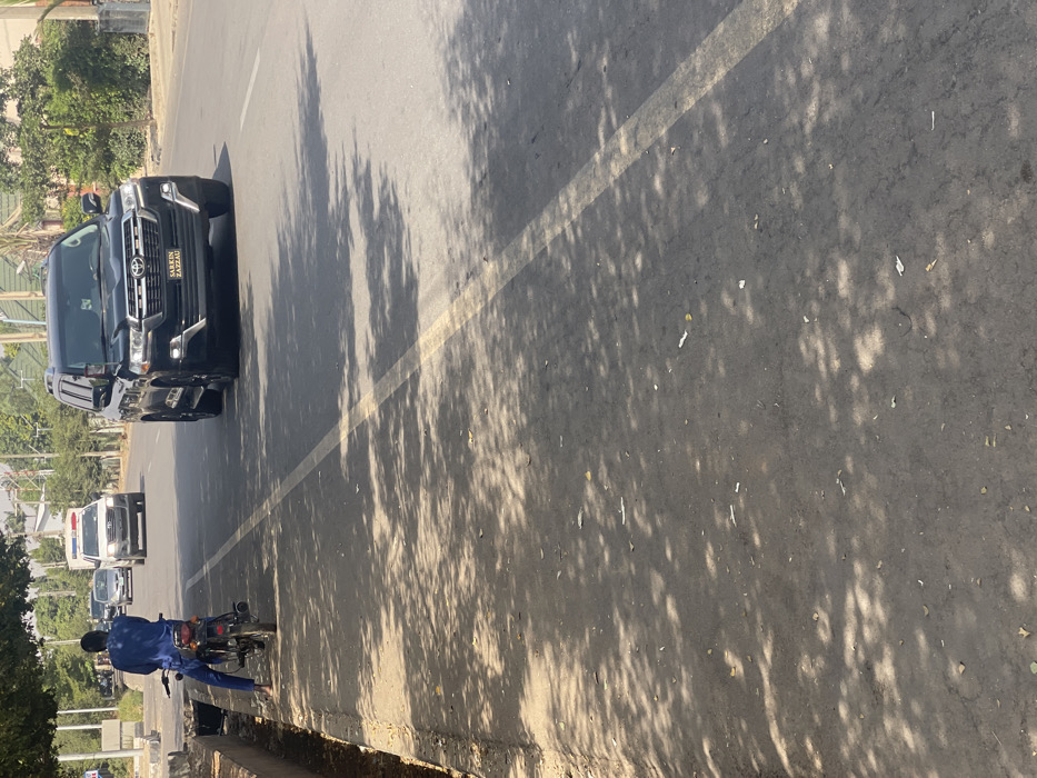 The image depicts a daytime street scene in Hanwa, Nigeria. A paved multi-lane road, marked with a solid yellow dividing line, runs through the center. Strong sunlight casts numerous dappled tree shadows across the road surface and a dirt shoulder. In the left midground, a man wearing a blue long-sleeved outfit is seated on a black motorcycle, facing away from the viewer. His bare feet are positioned near the ground. The motorcycle is situated on an unpaved, debris-strewn shoulder adjacent to a concrete curb and a visible drainage ditch. On the paved road, a black Toyota Land Cruiser SUV occupies the right midground, traveling towards the viewer or stationary. It displays a front license plate reading "SARKIN ZAZZAU" and a small flag on its front passenger side. Further down the road, behind the SUV, a white pickup truck with emergency lights mounted on its roof is visible, proceeding in the same direction. Additional vehicles are present in the distant background, indicating active traffic. The background shows buildings and trees lining the street under a clear sky.