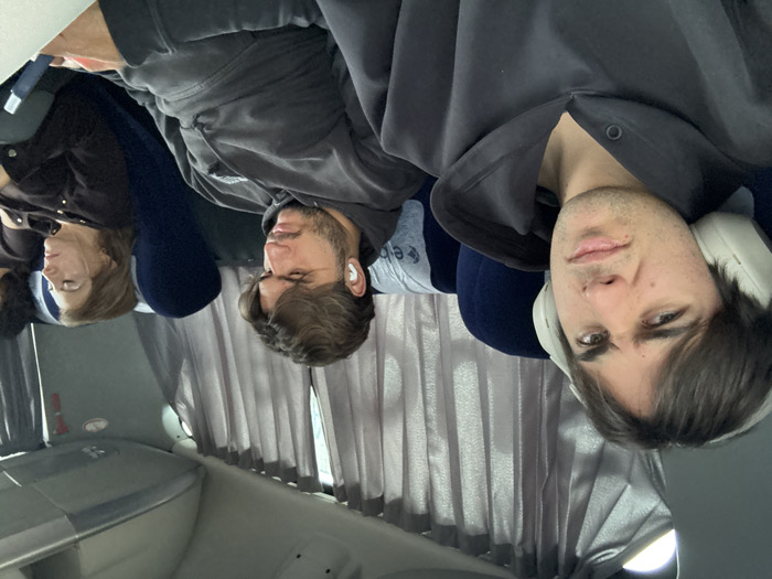 A photo shows three people and part of a fourth, seated on what appears to be an airplane. The individual nearest the camera is a young man wearing large headphones and a dark grey zip-up jacket. Next to him is another man in a grey hoodie and what looks like an earbud in his ear. Seated further back is an older woman in a dark jacket, and a portion of another person’s curly hair. The background consists of window curtains. The photograph seems to be rotated counter-clockwise.
