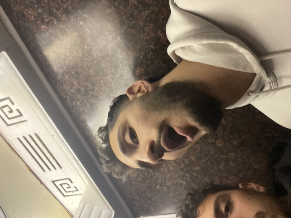 The image depicts two males inside what appears to be a New York City subway car. The subject on the right, a male with dark hair, a beard, and a mustache, is shown with his mouth open and tongue extended, wearing a light-colored hooded sweatshirt. A second male subject, with dark, curly hair and a mustache, is partially visible on the left, showing his upper face. The interior features dark, mottled brown walls, likely polished stone, and a ceiling panel with white trim that includes parallel horizontal lines and a repeating spiral or square key pattern.