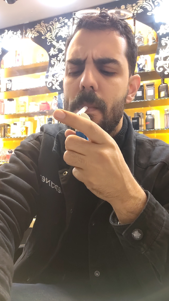 An adult male with dark hair, a beard, and a mustache is depicted indoors, smoking a white cigarette held between his left thumb and index finger