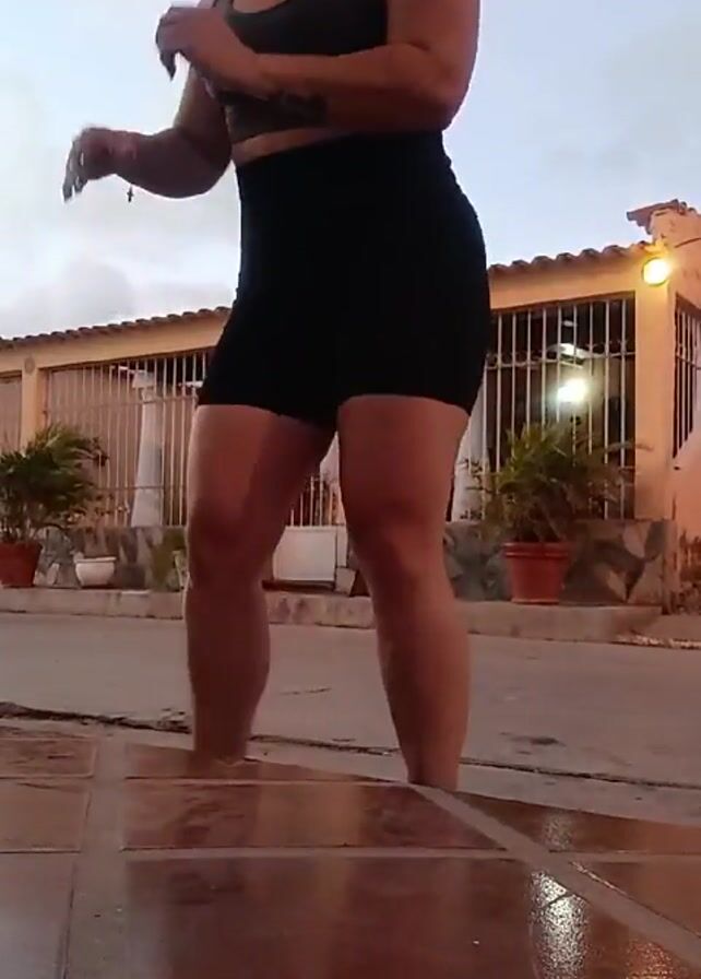 A woman is performing a dynamic exercise routine on a paved surface. She is wearing a black sports bra and black shorts. She squats down and alternately lifts her knees high. The surface she is exercising on is wet and reflects the ambient light. In the background is a building with barred windows and potted plants near its entrance. The lighting suggests it is either early morning or late evening.