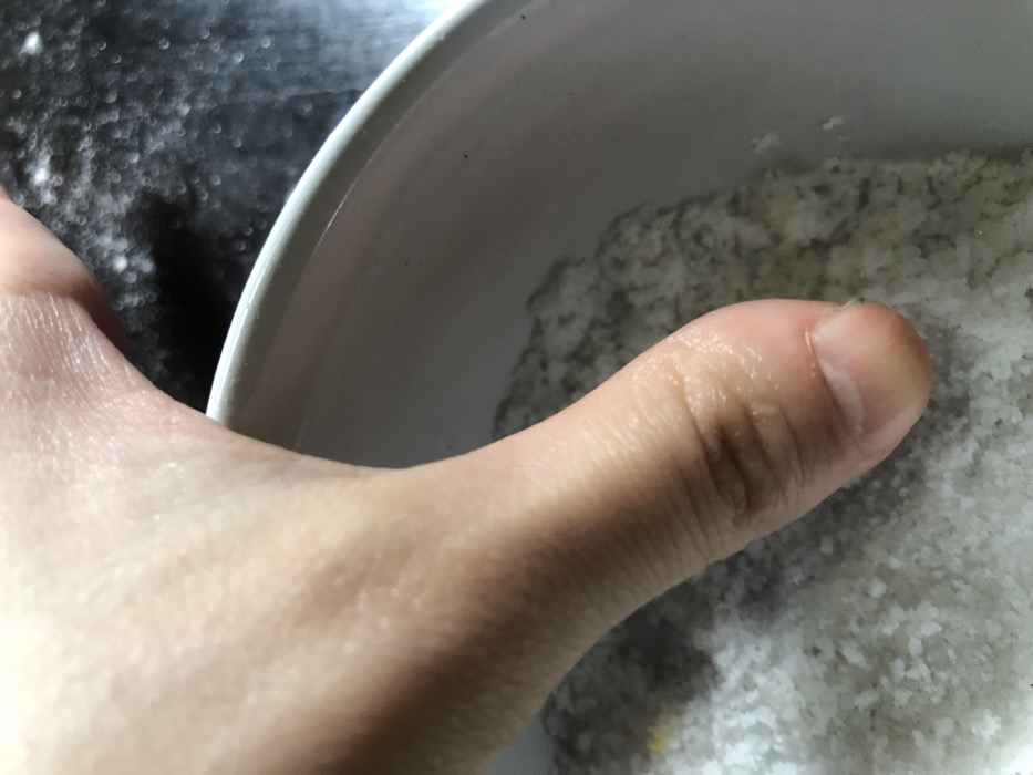close-up of a person's thumb pressing into a bowl of white granulated salt