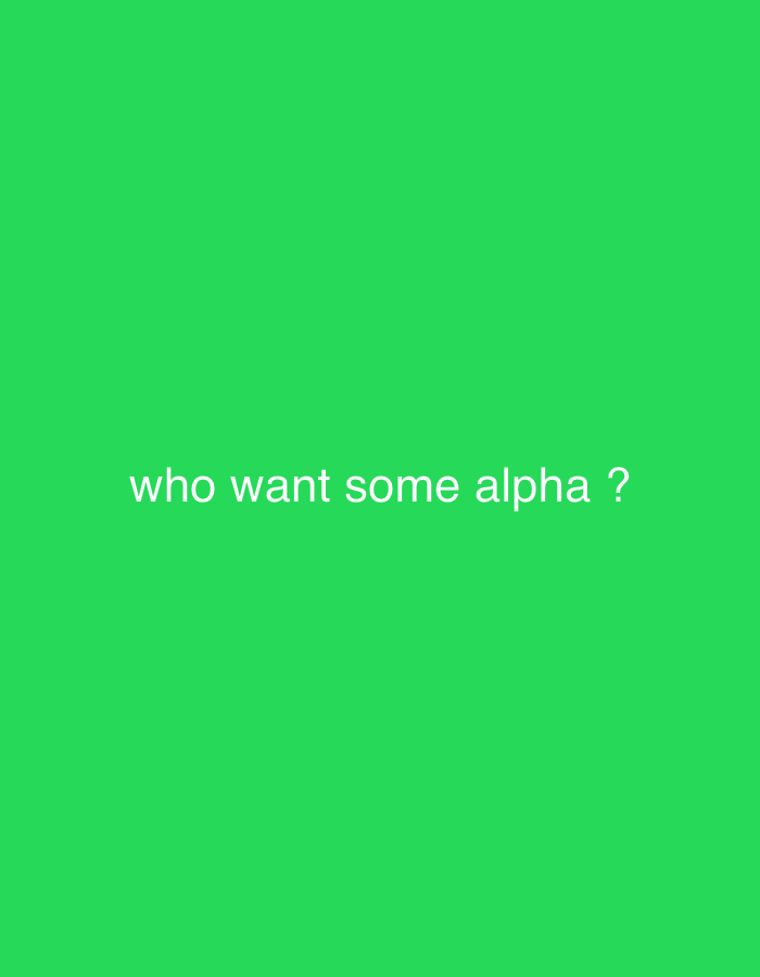 The image displays a solid green background with white, sans-serif text centrally positioned. The text reads: "who want some alpha ?". No individuals, subjects, objects, actions, interactions, or environmental settings are depicted. The image contains no visual information to indicate a specific physical location, including one within the city of Puteaux, France.