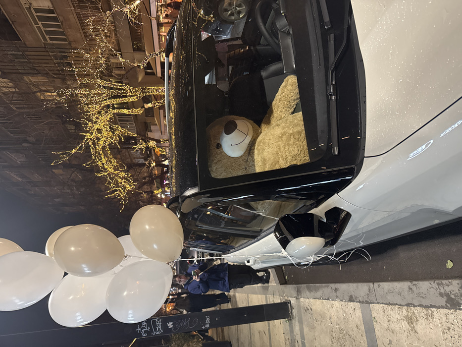 A white crossover utility vehicle is parked curbside on a city street at night in Yerevan, Armenia. Approximately eight white and off-white balloons are tied to the vehicle's driver-side mirror. A large, light brown teddy bear occupies the front passenger seat, facing forward. The vehicle's exterior surfaces are wet. In the background, a row of multi-story buildings lines the street, with bare trees illuminated by warm-toned string lights. Several indistinct figures are visible walking on the sidewalk, with one individual in a blue jacket partially visible behind the balloons, looking at a mobile device. Street lighting is visible overhead, and the overall scene is urban.