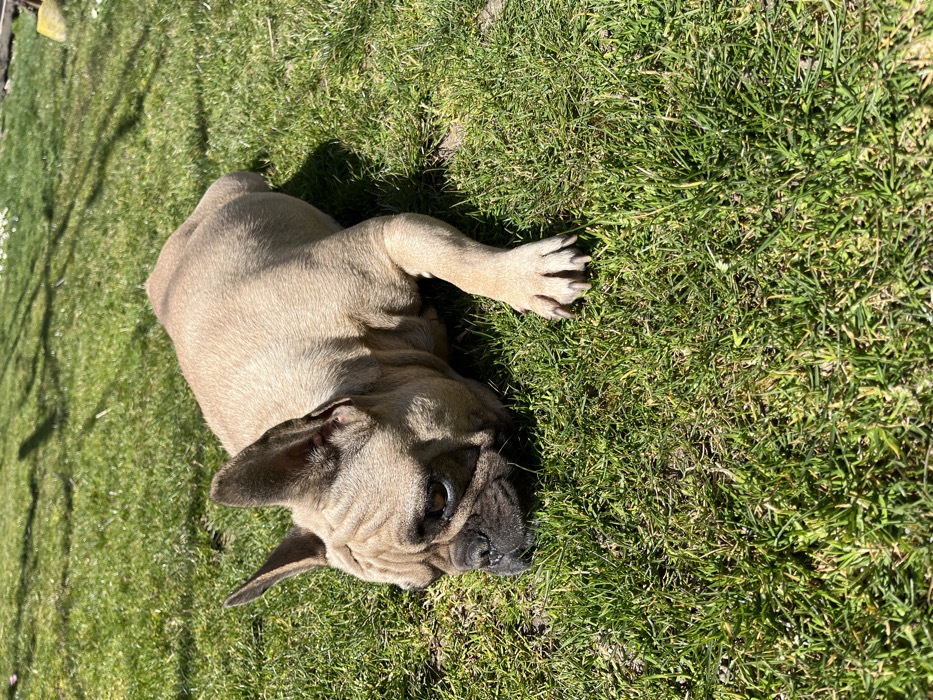 - "A fawn-colored French Bulldog is depicted lying prone on green grass under direct sunlight in an outdoor area of Sheynovo, Bulgaria" by FM-yO5cv1, licensed under CC BY 4.0