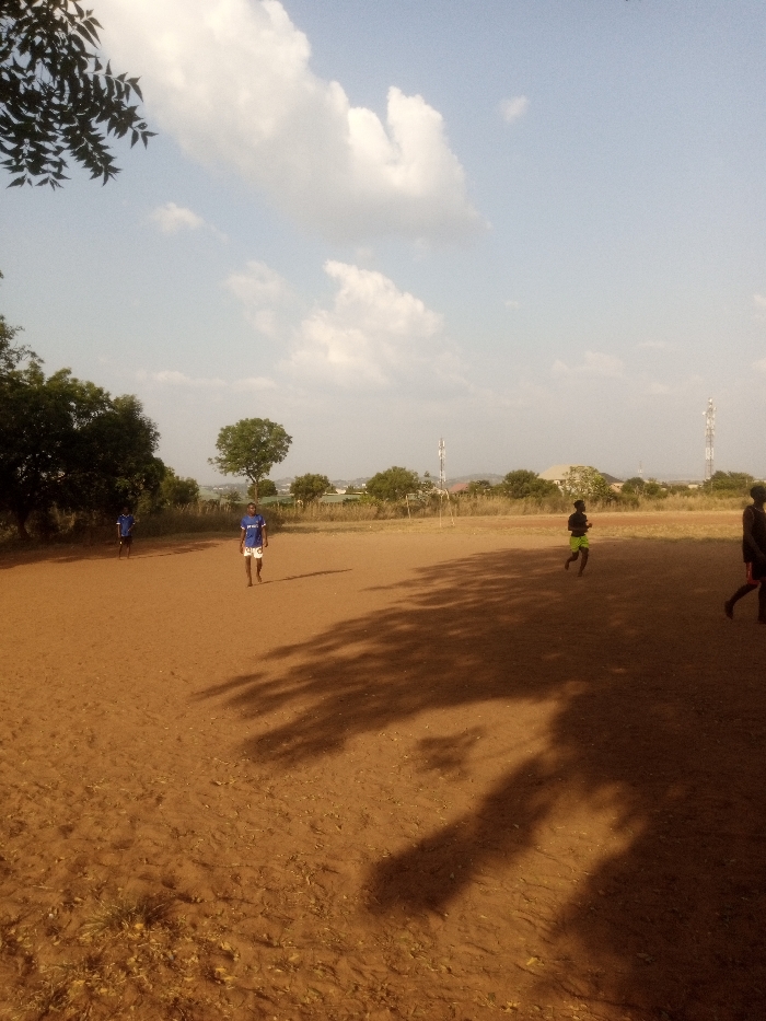 A dirt field under a partly cloudy sky. Several young people are scattered across the field, some wearing blue soccer jerseys. Long, dark shadows stretch across the reddish-brown dirt, likely from trees on the field's edge. In the distance, a soccer goal and communication towers are visible, suggesting a semi-rural or suburban environment.