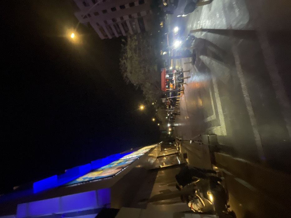 A night scene focuses on a brightly lit street corner with a building facade adorned in blue. Overhead lights illuminate parked motorcycles along a sidewalk. Across the street, a food stall or vendor cart, lit in red, is surrounded by a small gathering of people. A large building is in the background, dimly illuminated by streetlights and possibly its own lighting. The scene has a slight tilt, possibly due to the camera angle.