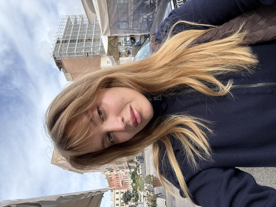 A young adult female is depicted in a close-up, selfie-style photograph, directly facing the camera with a neutral expression. She has long, light brown hair with bangs, green/hazel eyes, and light skin with visible blemishes; her lips are glossy. She is wearing a dark blue, long-sleeved top with a silver-toned zipper and a brown, possibly woven, bag strap visible over her right shoulder. The scene is outdoors in Anzio, Italy, under a partly cloudy sky. To the subject's left, a cafe patio area with white tables, chairs, and potted plants is visible, bordered by multi-story buildings with light-colored facades. To the subject's right, a multi-story building undergoing renovation is covered in extensive scaffolding. Below this building, street stalls with white coverings are present, along with a dark-colored vehicle and a partially visible individual wearing a green top.