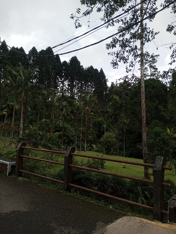 An outdoor scene in Cimacan, Indonesia, depicts a verdant, densely vegetated landscape under an overcast sky. In the foreground, a dark asphalt surface slopes gently downwards from right to left. A rustic fence composed of two dark, possibly concrete, vertical posts and three horizontal, rusted metal bars runs along the edge of the asphalt, bordering a grassy area to the right. Beyond the fence, a manicured lawn extends a short distance before giving way to a dense growth of various trees and underbrush. Prominent are several tall palm trees with slender trunks interspersed with other broadleaf trees. In the midground and background, a thick line of tall, dark green coniferous-like trees forms a dense wall across the upper left and center. Further to the right, additional forested hills are visible. Overhead, multiple dark electrical or communication wires are strung horizontally across the frame, partially obscured by the branches of a large tree with light-colored bark on the far right. No individuals or man-made structures beyond the fence and wires are discernible.