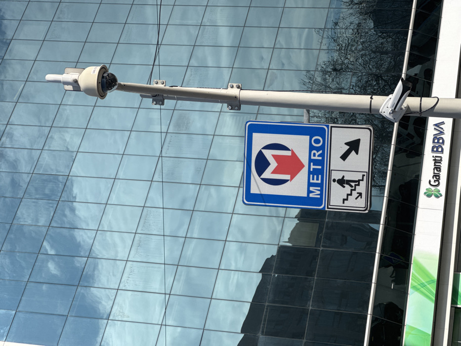 The image depicts a street pole with integrated security cameras and public transport signage, positioned in front of a modern building with a reflective glass facade in Kâğıthane, Istanbul, Turkey. This specific location is identified as the vicinity of the Kağıthane Metro Station. A light-colored pole stands prominently, supporting two distinct security cameras and two stacked informational signs. The uppermost device on the pole is a white, dome-shaped pan-tilt-zoom (PTZ) security camera, oriented forward. Below it, a white, fixed-mount bullet-style security camera is affixed, pointing downward and to the right. Directly below the cameras, two signs are displayed. The top sign is a blue square with a white border, featuring a white circle containing a red, downward-pointing "M" symbol, with the word "METRO" in white capital letters beneath it. Below this, a white rectangular sign with a black border shows a black pictogram of a person descending stairs on the left, and a solid black arrow pointing diagonally downward and to the right on the right. These signs collectively indicate the presence and direction of a metro station entrance. The background is dominated by a multi-story building presenting a gridded, reflective glass facade that mirrors the cloudy sky and indistinct outlines of bare tree branches. Below the extensive glass section, a portion of a commercial establishment is visible, featuring a green and white "Garanti BBVA" logo and text. No individuals are present within the captured scene. The environment indicates a developed urban commercial area with infrastructure for public transport and security monitoring.