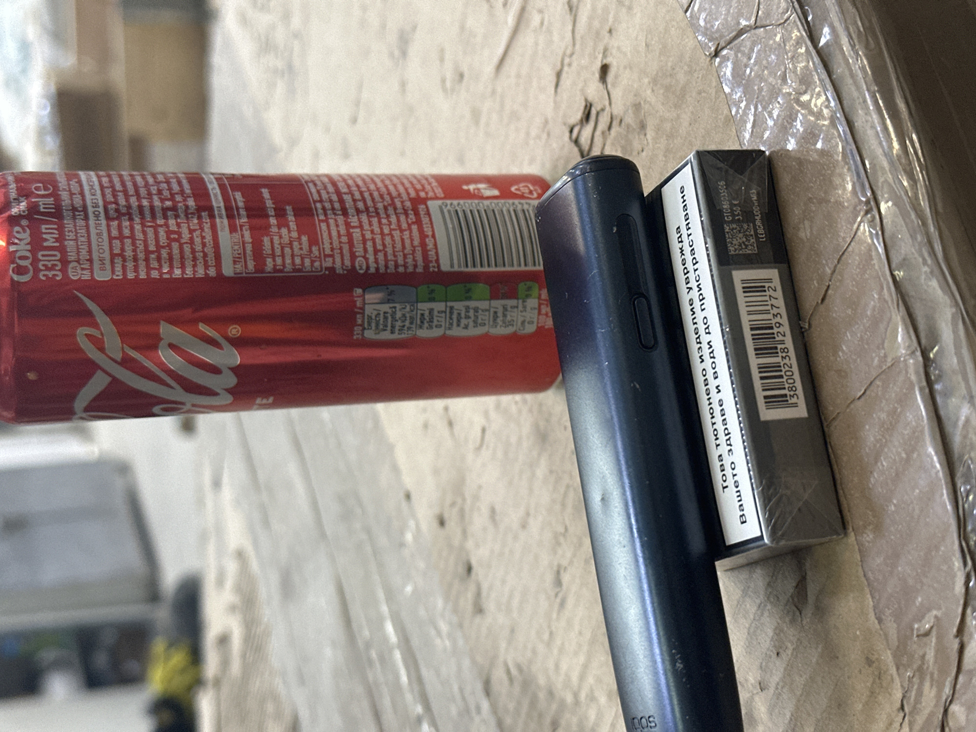 The image displays a close-up, slightly overhead view of three distinct items arranged on a light-colored, worn surface in the city of Sevlievo, Bulgaria. To the right, a red Coca-Cola can with white branding, marked "Coke." and "330 ml / ml e", stands upright. Its label includes text in Cyrillic, primarily Ukrainian, with mentions of production in Ukraine and regulatory codes referencing both Ukraine and Moldova. In the foreground, a dark grey/black IQOS electronic heated tobacco device is positioned horizontally, resting directly on top of a rectangular pack of tobacco sticks. The IQOS device features a matte finish and a visible "IQOS" logo on its side, along with a small circular button. The dark grey/black tobacco stick pack, partially encased in clear plastic film, prominently displays a health warning in Bulgarian: "ТОВА ТЮТЮНЕВО ИЗДЕЛИЕ УВРЕЖДА ВАШЕТО ЗДРАВЕ И ВОДИ ДО ПРИСТРАСТЯВАНЕ" (This tobacco product harms your health and leads to addiction). A barcode "3800238 293772" and a price of "3.50 €" are legible on one side of the pack. The items rest on a surface characterized by light-brown or beige tones, showing visible wear, scuffs, and minor debris, consistent with a wooden or laminate workbench or floor. The background is out of focus, revealing blurred elements of an indoor, utilitarian environment, possibly a workshop or storage area, with light-colored walls or structures and indistinct yellow objects on the floor. The Bulgarian health warning confirms the location within Bulgaria.