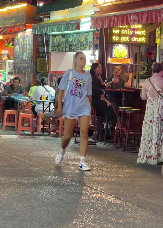 The scene unfolds on a bustling street, likely during the evening or at night, evidenced by the presence of neon signs and the general lighting conditions. A woman in a light blue t-shirt featuring a cartoon bear, denim shorts, and sneakers walks directly towards the camera. She carries a white shoulder bag. To her right, a couple walks with their arms around each other. The man wears a white patterned shirt and blue shorts, while the woman is in a green shirt and white shorts. Behind them, people are seated at the Lucky Bar, which displays a neon sign with the text "we only want to get drunk." Additional people can be seen seated at tables along the street. Overall, the setting appears to be a lively, tourist-oriented area.