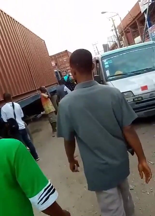 The video depicts a bustling street scene, likely a market or commercial area. Several people are seen walking around, some interacting with each other. A silver van is parked on the side of the road, next to a hand-pushed cart loaded with cell phone cases and sandals for sale. In the background, there are large shipping containers and multi-story buildings. The setting appears to be an urban environment with a mix of commercial and residential structures.