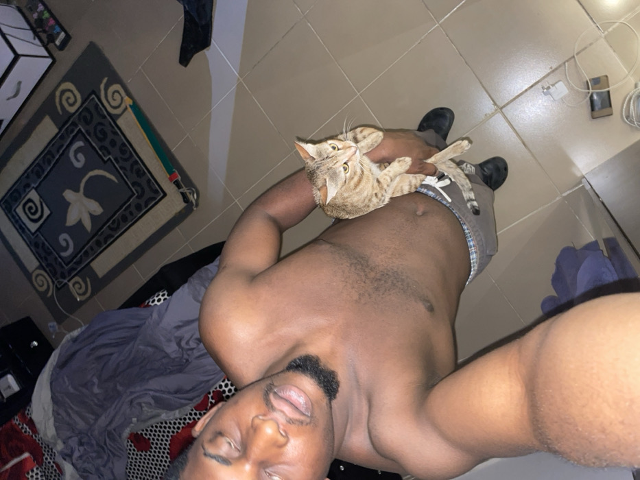 A shirtless man lies on his back, with his legs bent at the knees. A light brown tabby cat with stripes is perched on his lower stomach and groin area. The man has dark skin, a short beard, and closed eyes. He wears black shoes. A patterned rug is on the floor, as are charging cables and a phone. The image is taken from a high angle, looking down at the man. Bedding and furniture are visible in the background.