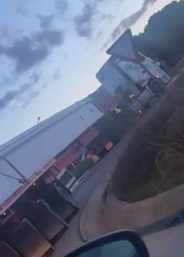 white semi-truck and trailer struggling to navigate a sharp turn on a road. The truck is partially blocking the lane. A yield sign is visible near the truck. The footage is taken from a car stopped behind the truck. The sky is cloudy and it appears to be dusk.