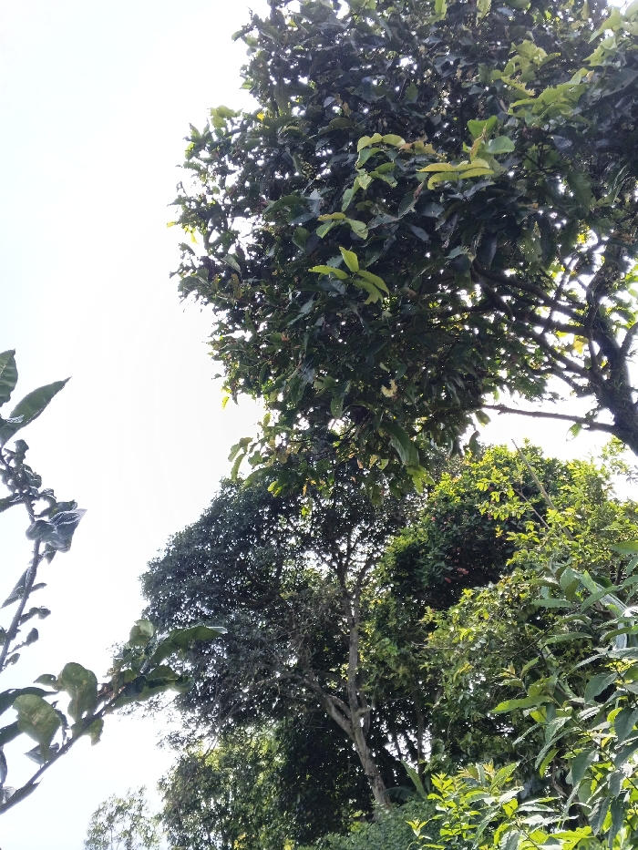 Lush green foliage fills the frame, featuring various trees and plants against a bright, overcast sky. Sunlight filters through the canopy, creating dappled light patterns. The trees extend upwards, their branches intertwined. The leaves are a mix of light and dark green, showcasing the diversity of the vegetation. The image is taken from a low angle, emphasizing the height and density of the foliage.