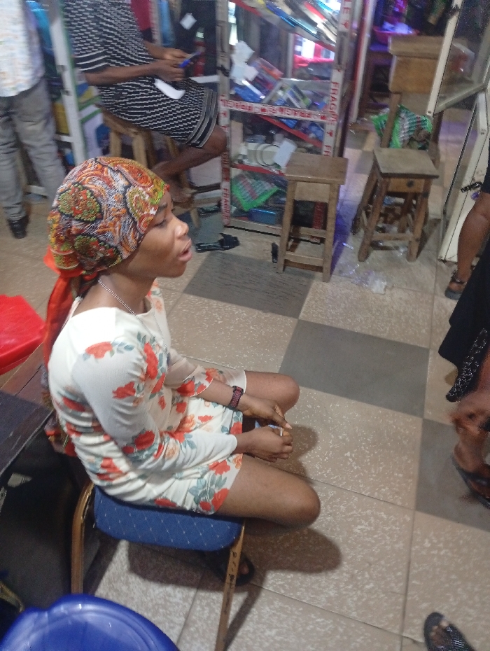 An interior scene in a retail establishment in Fegge, Nigeria, depicts an adult female seated on a blue-cushioned metal chair in the foreground, facing right with her mouth slightly open