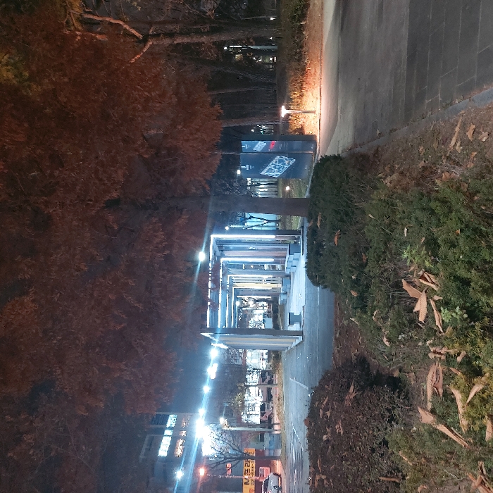 This nighttime image depicts an urban park or plaza environment in Gimpo-si, South Korea. The scene is illuminated by various artificial light sources, casting a cool tone with warm accents. In the midground, a modern, open-air structure, possibly a pergola or art installation, is centrally located. It consists of multiple vertical rectangular panels, featuring integrated blue-white perimeter lighting, creating a luminous framework. Several dark grey benches are positioned within and around this structure. To the left of this structure, a paved area, likely a parking lot, is partially visible with faint vehicle shapes and white lane markings in the distance. Further left, a multi-story building with numerous illuminated windows is prominent. Overhead, and extending across the upper portion of the frame, are large trees with dense reddish-brown foliage, indicating an autumn season. Some trees appear more sparsely leafed on the right. The foreground features a bed of green shrubbery mixed with patches of dried, dark reddish-brown foliage and scattered fallen leaves. To the right, a paved walkway of dark grey stone tiles extends from the foreground into the background. A small, ground-level lamppost emitting an orange glow is situated beside this path. Two dark, rectangular freestanding signs, displaying light-colored geometric patterns or text, are positioned near the modern structure and the paved path on the right. The far right background reveals a dense, dark treeline. Multiple bright streetlights are visible throughout the background and midground on the left, contributing to the overall illumination. No individuals are present in the scene, and no specific actions or interactions are observed.