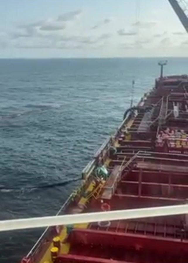 From the deck of a large red ship, the camera captures a view of the open ocean under a partly cloudy sky. The water is dark blue and choppy. The ship's deck is visible, with a complex of red and yellow structures. A crane is situated on the ship. Two people are on the deck, working near some yellow railings and equipment. A dark hose or pipe extends from the ship into the water.